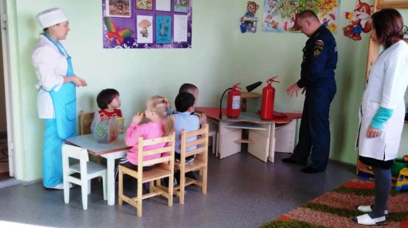 The lesson on "Fire-both friend and enemy" was held during the conversation. The employee of the Ministry of emergency situations asked kids such questions as what to do if there was a fire, why it is impossible to play with matches. After talking to the children from all the groups, the SFS inspector switched to the adults.