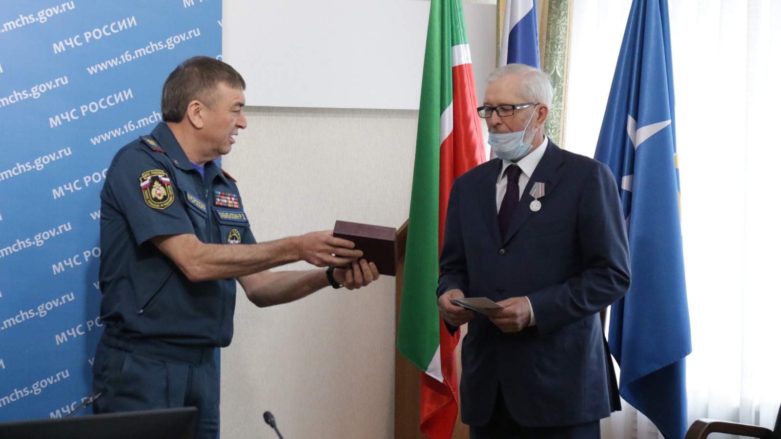 Today, one of the first heads of the republican emergency department, Minzagit Islamgirovich Ziganshin, was honored at the Main Department of the EMERCOM of Russia for the Republic of Tatarstan. The head of the EMERCOM of Russia for the Republic of Tatarstan, Lieutenant General of the Internal Service Rafis Khabibullin, presented the venerable aksakal with the state award of the Republic of Tatarstan-the medal "For Valiant Labor".