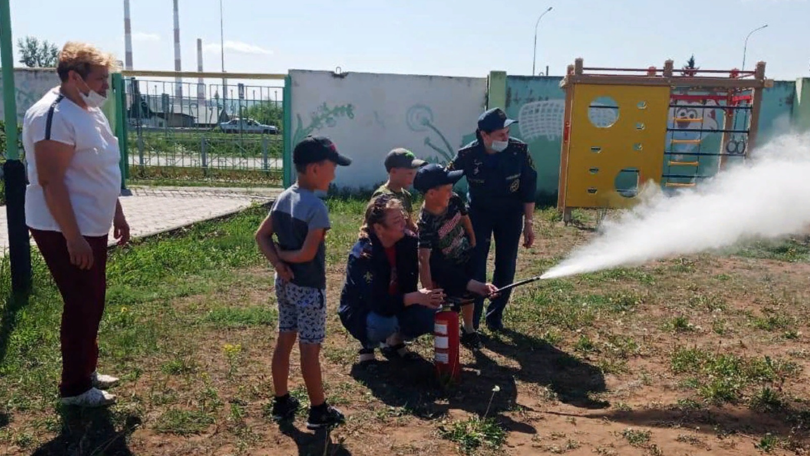 Having gathered on the street after the evacuation, each child was able to try himself as a firefighter, applying his knowledge in extinguishing an imaginary fire with a fire extinguisher.