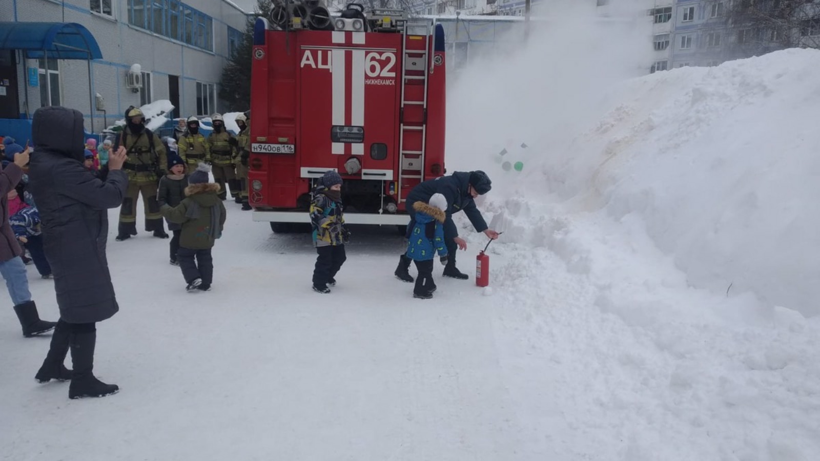 On the eve of Defender of the Fatherland Day, firefighters of the Nizhnekamsk Fire and Rescue garrison came to visit the pupils of kindergarten No. 68 in Nizhnekamsk on a fire tanker truck to tell the kids about the heroic profession of a firefighter.