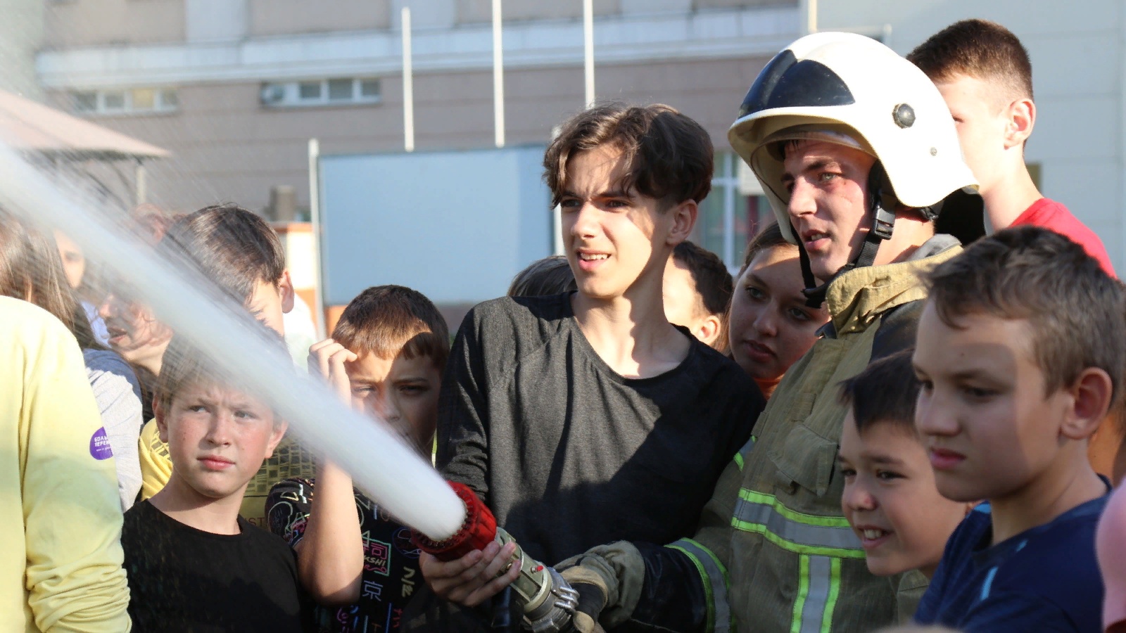 The guests from the Ministry of Emergency Situations staged an exciting competition between the platoons to pull the fire hose. And for dessert, there was shooting water from a fire barrel at signal cones.