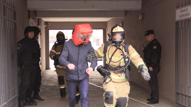 По легенде в здании суда на 1 этаже произошло возгорание в служебном помещении. Сотрудники из числа судебных приставов организовали эвакуацию персонала суда. Всего было эвакуировано 356 человек. После чего на улице со всех сторон стали слышны звуки сирен машин экстренных служб. Несколько пожарных автоцистерн и одна пожарная автолестница подъехали к зданию со стороны внутренних ворот. Звено газодымозащитников, добравшись до помещения, где произошло возгорание, обнаружили там условного пострадавшего. Пожарные эвакуировали его из помещения через оконный проем, надев на пострадавшего маску спасаемого. Затем пожарные доставили пострадавшего до машины скорой помощи. Также спасатели провели боевое развертывание и приступили к тушению возгорания. Все экстренные службы сработали слаженно и оперативно, поэтому уложились в нормативное время.