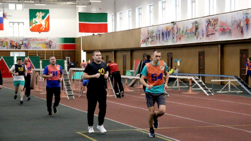 После чего военнослужащие и сотрудники отправились в спортивный манеж, где им предстояло сдать нормативы по физической подготовке. В спортивную программу входило: подтягивание на перекладине, челночный бег, кросс на дистанции 1 км, а для сотрудников Федеральной противопожарной службы подъем по штурмовой лестнице в окно 4 этажа учебной башни.