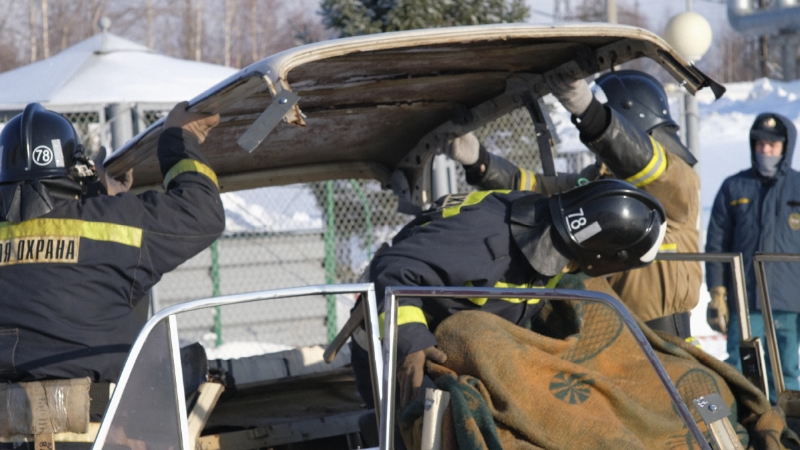 Оградив место ликвидации последствий условного ДТП, пожарные предпринимают меры к устойчивости автомобиля, установив «башмаки» под каждое колесо и «пирамиды» под пороги с обеих сторон, чтобы автомобиль не двигался и не раскачивался во время проведения аварийно-спасательных работ. Обесточивают внутреннюю бортовую электросеть автомобиля путем отсоединения клемм аккумулятора. И, разбив заднее стекло, добираются до пострадавших, где накрывают их покрывалами, чтобы в дальнейшем не травмировать. Затем разбивают передние и боковые стекла, при помощи гидравлического аварийно-спасательного инструмента демонтируют крышу автомобиля и до приезда медицинской службы оказывают пострадавшим первую помощь. Одному из пострадавших накладывают шейный воротник, другому - шину на руку и извлекают их из автомобиля. Далее накладывают еще шину и на поврежденную ногу пассажира. Поместив потерпевших в условную карету скорой медицинской помощи, команда спасателей ставит точку в выполнении практической части данных соревнований.