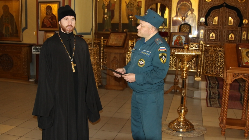 Инспекторы в ходе осмотра обнаружили на видных местах два исправных огнетушителя. Следуя рекомендациям, служители храма установили в местах хранения огнетушителей специальные наклейки, которые указывают, где находятся данные первичные средства пожаротушения. Были проверены выходы - основной и запасной. Над ними также установили соответствующие обозначения. В случае отключения электричества эти наклейки укажут людям места для эвакуации.