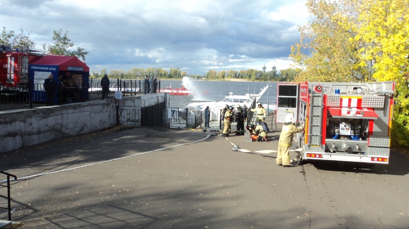 Тренировочное пожарно-тактическое учение состоялось в Казанском пассажирском порту. В соответствии с замыслом пожарно-тактических учений, в результате нарушения эксплуатации энергетических установок в машинном отделении теплохода «Восход-51» произошел пожар. Возникла угроза взрыва топливных емкостей и распространение огня на примыкающие жилые и служебные помещения.
