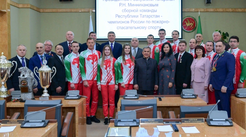 Сегодня в Доме Правительства состоялась церемония чествования сборной команды Республики Татарстан по пожарно-спасательному спорту - победителей розыгрыша Кубка МЧС России и Кубка Центрального совета Всероссийского добровольного пожарного общества. В данном турнире участвовали 12 сильнейших российских команд, возглавляющие рейтинг лучших в пожарно-спасательном спорте. В жесточайшей борьбе, где итоговый результат определялся разницей в сотые доли секунды, сборная команда Республики Татарстан сумела одержать победу. В борьбе за почётный приз татарстанцы опередили команды Ханты-Мансийского автономного округа и Московской области, занявшие в итоговом протоколе 2 и 3 места соответственно.