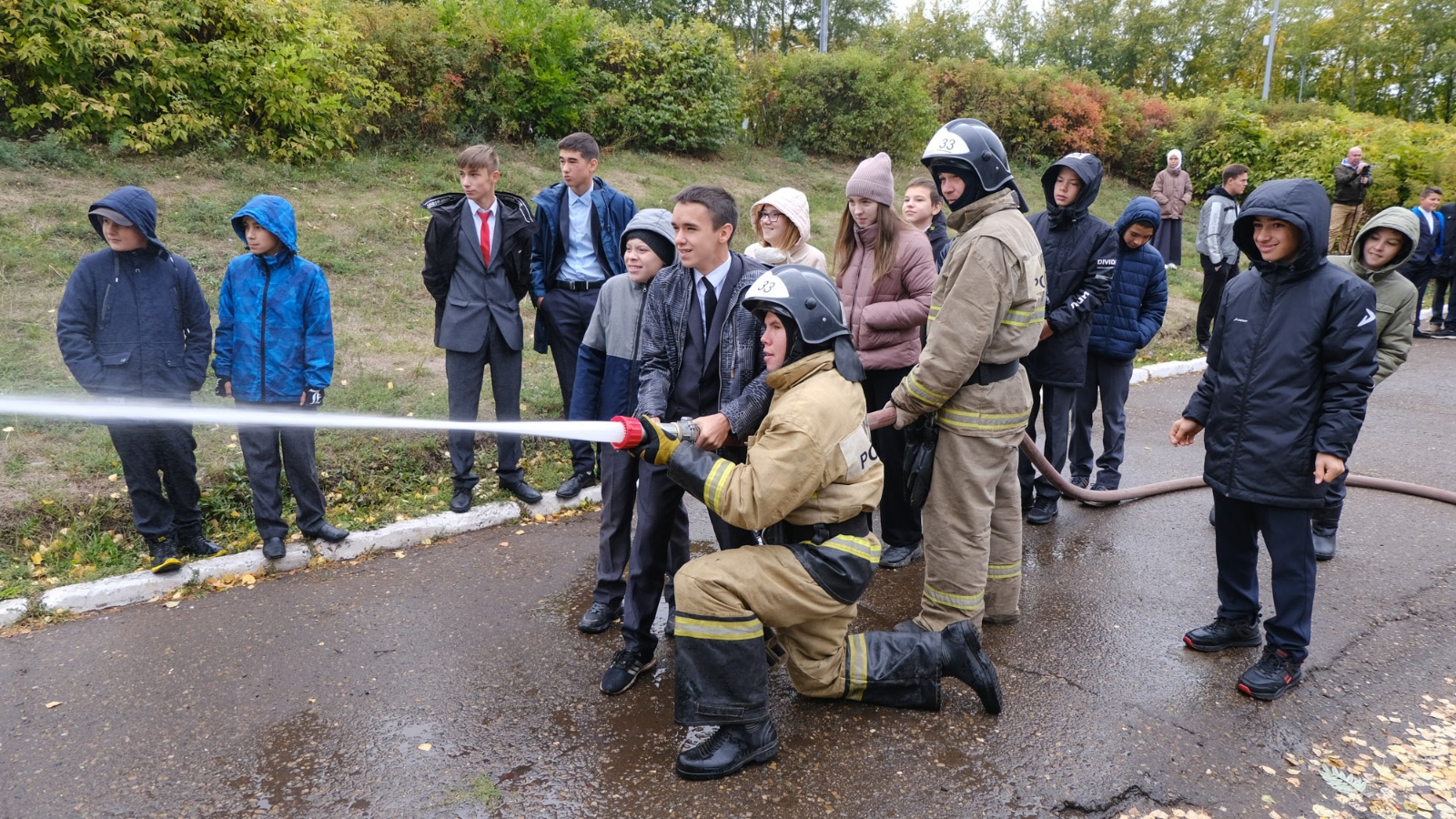 Для школьников огнеборцы провели показательную пенную атаку. Ученики сбивали напором воды из пожарного ствола мишень, резали пруты арматуры гидравлическим аварийно-спасательным инструментом, попробовали «на вкус» воздух в дыхательном аппарате газодымозашитника, облазили вдоль и поперек пожарный автомобиль!