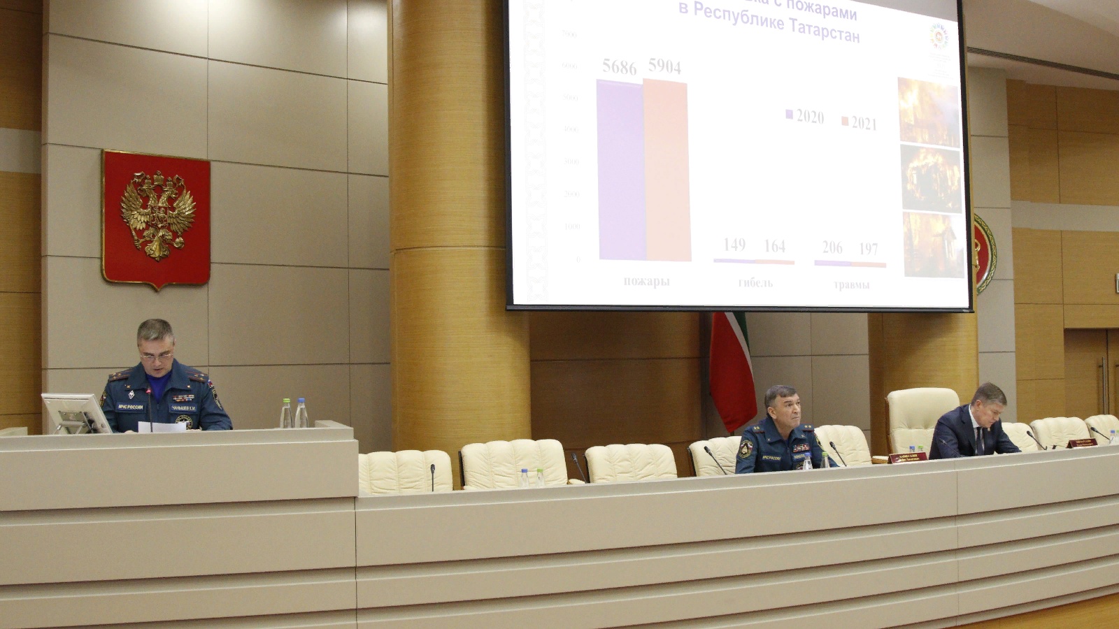 Далее, с докладом «О дополнительных мерах по недопущению роста пожаров и гибели людей на водных объектах в зимний период, а также о состоянии пожарной безопасности объектов проведения праздничных мероприятий и использовании пиротехнических средств» выступил заместитель начальника Главного управления МЧС России по Республике Татарстан Константин Чанышев.