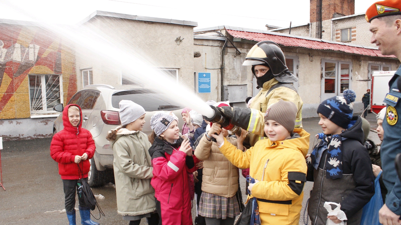 Ну а самое интересное ожидало первоклашек в завершении интересной и познавательной экскурсии. Огнеборцы продемонстрировали детям силу и мощь воды над огненной стихией. Ребята, к своему восторгу увидели, что струя воды может быть разной – то она прямая, то распылённая - это зависит от того, что приходится тушить.