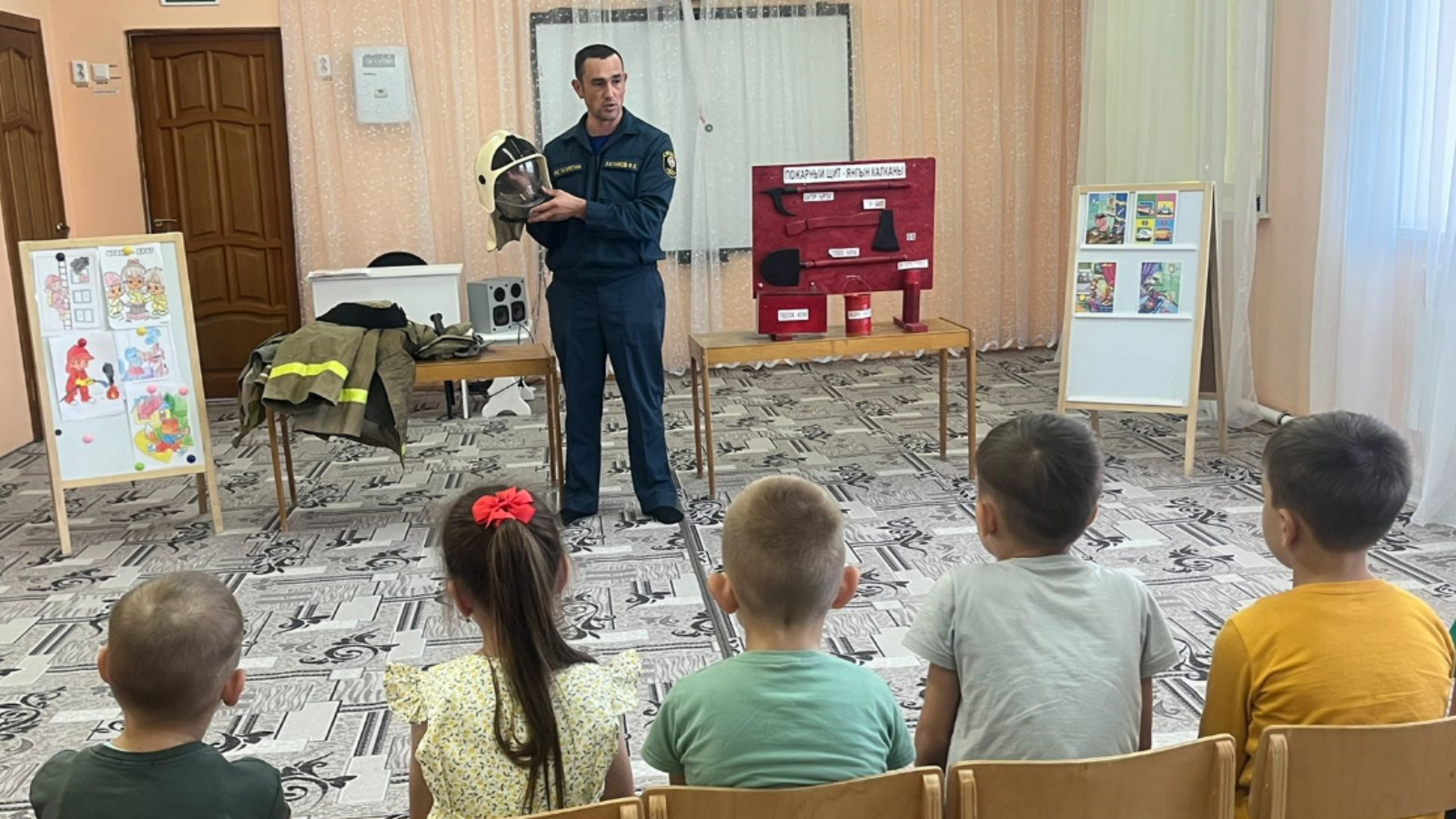 Особый восторг у малышей вызвала демонстрация настоящей боевой одежды пожарного. Возможность рассмотреть и прикоснуться к экипировке героической профессии сделала урок наглядным и запоминающимся.