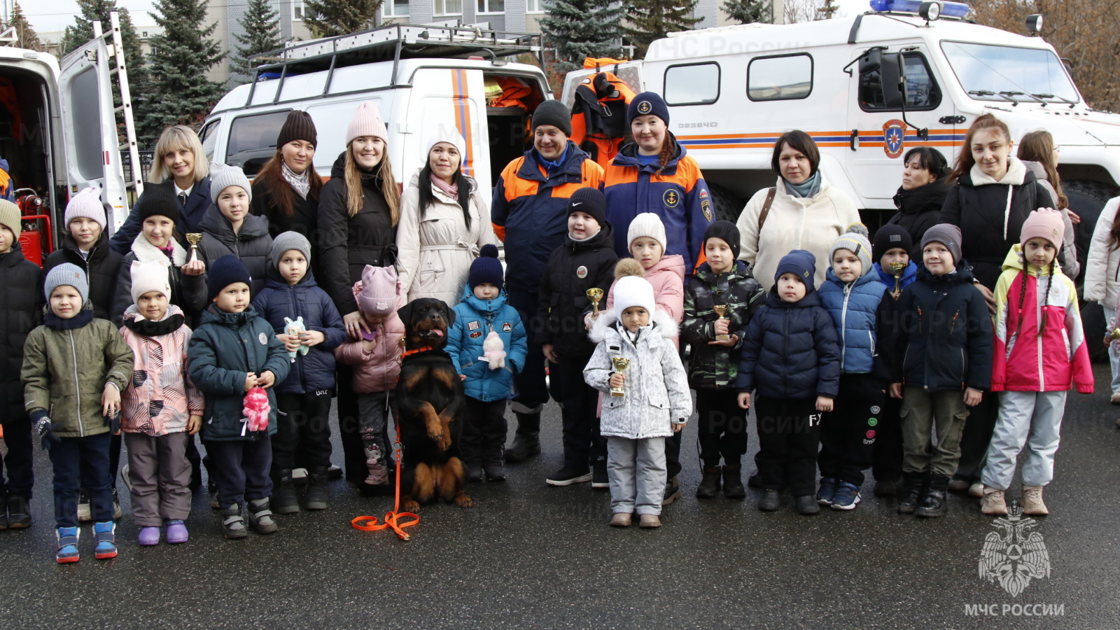 Обожающая детей четвероногий спасатель ротвейлер Мерел не могла усидеть на месте, всё тянула кинолога-спасателя 1 класса Казанского поисково-спасательного отряда Ирину Федоткину в общество юных гостей. Для них у кинологического расчета было заготовлено выступление – демонстрация послушания и навыков. После представления все хотели сфотографироваться с улыбчивой Мерел, расположившейся в позе «зайки».