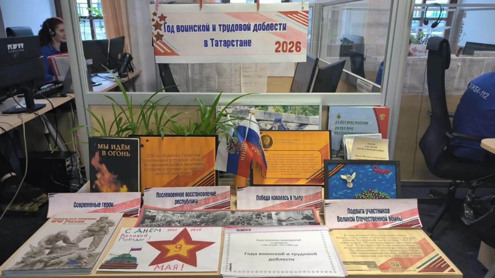 В рамках реализации Плана мероприятий, приуроченных к объявленному Раисом Республики Татарстан Рустамом Миннихановым Году воинской и трудовой доблести, в ГБУ «Служба-112» в центрах обработки вызовов г. Казани и г. Набережные Челны, оформлены и размещены информационно-просветительские выставка и стенд.