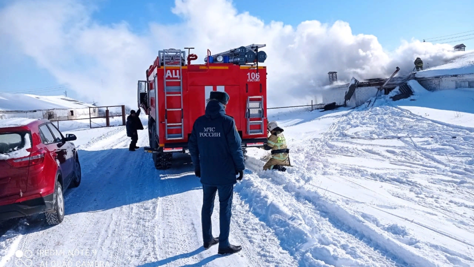 Килеп җиткәндә шундый хәл килеп чыкты, ферманың бер катлы кирпеч бинасындагы котельныйның түбәсе янды, бина эчендә төтенле була. Бүлекчәне ферма хезмәткәрләре каршы алды, алар бина эчендә кешеләр юк, дип аңлаттылар. Алар шулай ук сыерлар һәм бозаулар барлыгын әйттеләр. Әлмәндәр янгын сүндерүчеләре ферма хезмәткәрләре белән 77 баш мөгезле эре терлекне эвакуацияләделәр һәм су кәүсәсен тәрәзә аша янгын сүндерергә бирделәр.