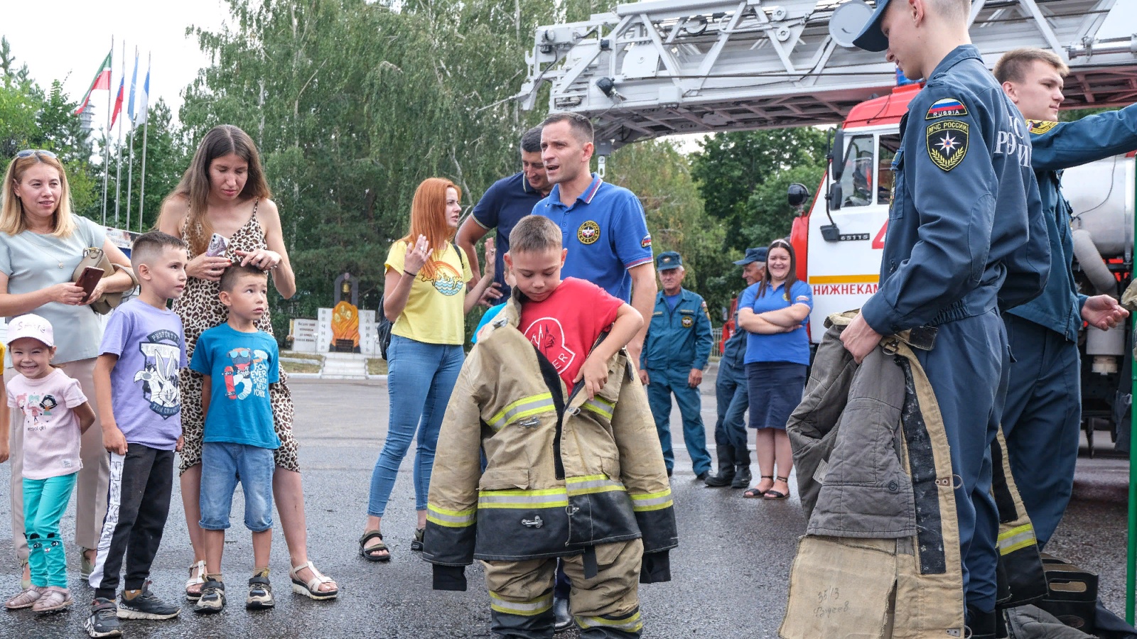 Малайлар һәм кызлар фасадта Түбән Кама сәнәгать комплексы объектларын саклаучы янгын сүндерү автомобильләре белән таныштылар. Алар янгын сүндерүченең сугыш киемен сынап карадылар һәм истәлекле фотога төштеләр!